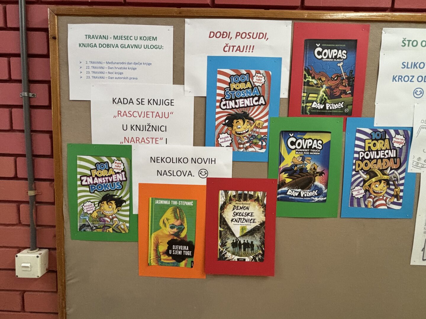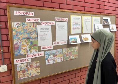 1. Povodom Mjeseca školskih knjižnica postavljen je mali slikovno čitateljski nagradni zadatak. Svakodnevno obilazite naš pano na kojemu se zadatci objavlju utorkom, srijedom i četvrtkom. Tko prvi uspješno rješi i odgonetne najveći broj knjižnih zagonetki bit će zasluženo i nagrađen.