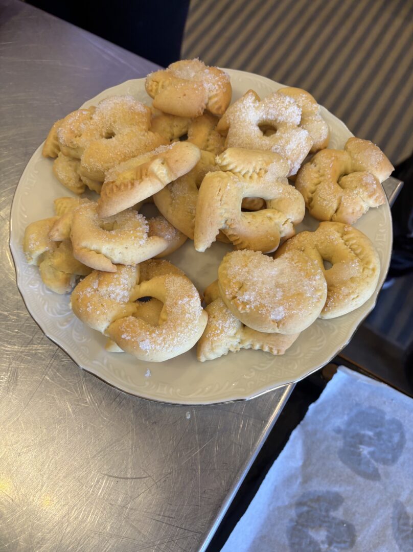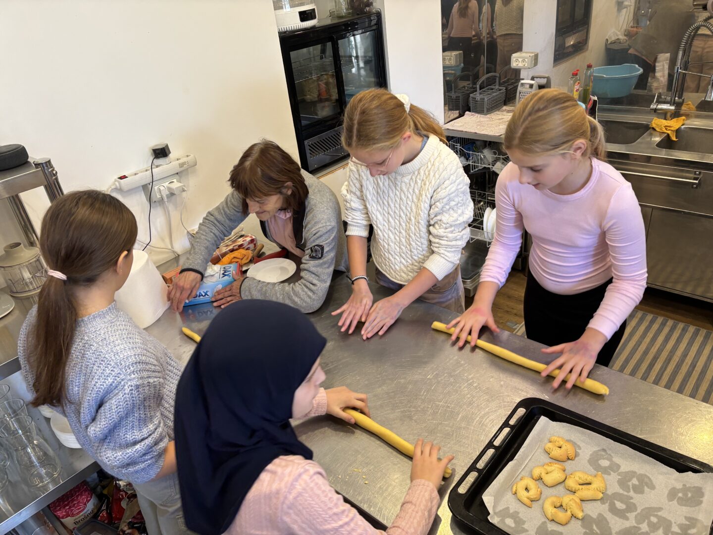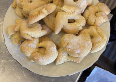 Prateću upute tete Fidesi izvornog recepta zamijesili smo prhko tijesto, zavaljali ga kako su nam pokazali, rezali, motali i oblikovali. Pekli smo ih pa još tople uvaljali u šećer.