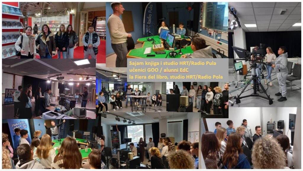 Giovedì 4 dicembre 2025, gli alunni che frequentano Educazione civica sono stati a Pola per un’uscita didattica alla Fiera del libro, Radio Pola e TV HRT1. Gli alunni sono partiti da scuola alle 8.30 verso la stazione dei treni e alle 8.50 sono saliti sul treno per andare a Pola. Arrivati a Pola, per prima cosa si sono diretti alla Fiera del Libro situata alla Casa dell’Armata. Dopo aver girato tra i padiglioni della Fiera per circa un’oretta, hanno fatto una bella passeggiata per la città, dopodiché si sono diretti verso gli uffici di Radio Pola e TV HRT1.